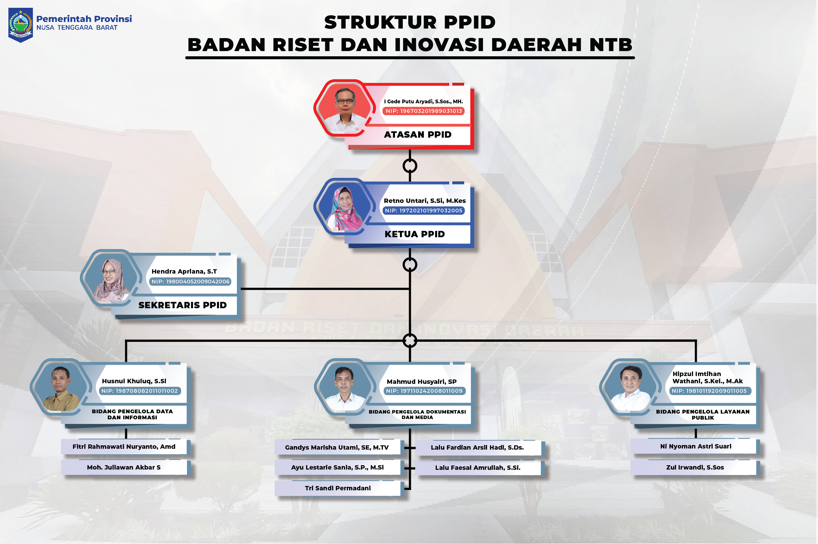 Tim Badan Riset dan Inovasi Daerah Provinsi NTB terdiri dari Kepala Badan, Sekretaris Badan, dan 4 Pokja, yaitu Pokja Riset Bidang Pemerintahan dan Pengkajian Peraturan, Pokja Riset Bidang Sosial dan Kependudukan, Pokja Riset Bidang Ekonomi dan Pembangunan, dan Pokja Inovasi, Hilirisasi dan Kemitraan.